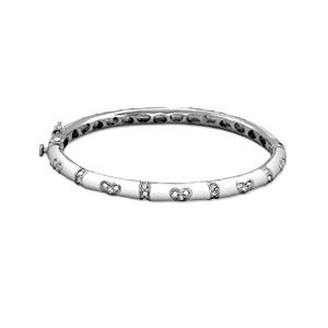 Cute baby gifts! This adorable white Baby bracelet is crafted from rhodium plated brass, coated with white enamel and sparkling cubic zirconias. Sparkling mini-hearts, paved with CZ diamonds, add twinkle to the baby bangle. Available for a small 4.5" wrist or medium 5" wrist, this dainty item has a lightweight wearing feel & an interlocking tongue clasp with wing closure to secure it. This bangle is made with the highest quality materials. Both a wonderful maternity gift & an accessory for your baby, this charming baby bracelet celebrates the bond between mother and child. Measures: Baby bangle bracelet fits small 4.5" wrist or medium 5" wrist - Width: 3/16" W Weight: 10, 12 grams respectively